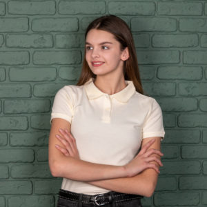 Бежева з коричневим воротом, планкою і манжетами футболка поло жіноча