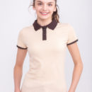 Бежева з коричневим воротом, планкою і манжетами футболка поло жіноча
