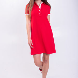 Сукня поло трапецією – вільного силуету. Модель трапеція, довжиною до коліна, з коротким рукавом і в’язаним манжетом, та відкладним комірцем. Відмінний варіант для літніх прогулянок. Дуже зручно, зовсім не стискує руху при ходьбі і практично не відчутно на тілі. Сукня трапеція є відкритим викликом жіночності, адже його основне завдання – наголосити на «потрібному» і сховати «зайве».