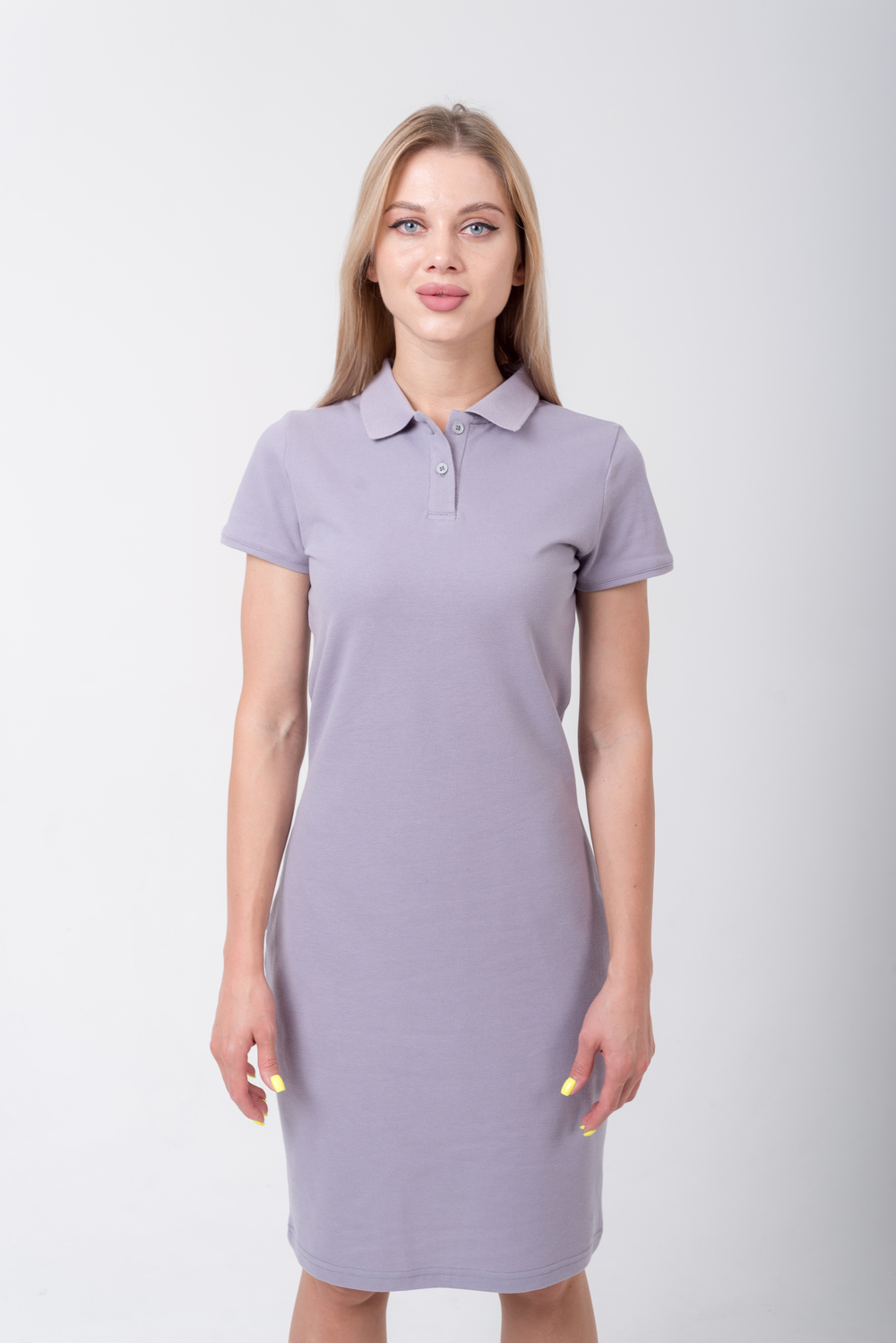 Сукня-поло жіноче вбрання у стилі casual. Просте по крою, але досить цікаве. Стильний, зручний та практичний варіант на кожен день. •Відкладний комір в’язаний •Коротка застібка на 2 ґудзики •Модель приталена •Короткі рукава, манжет в тон сукні з основної тканини
