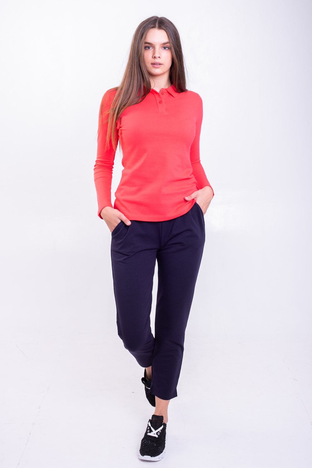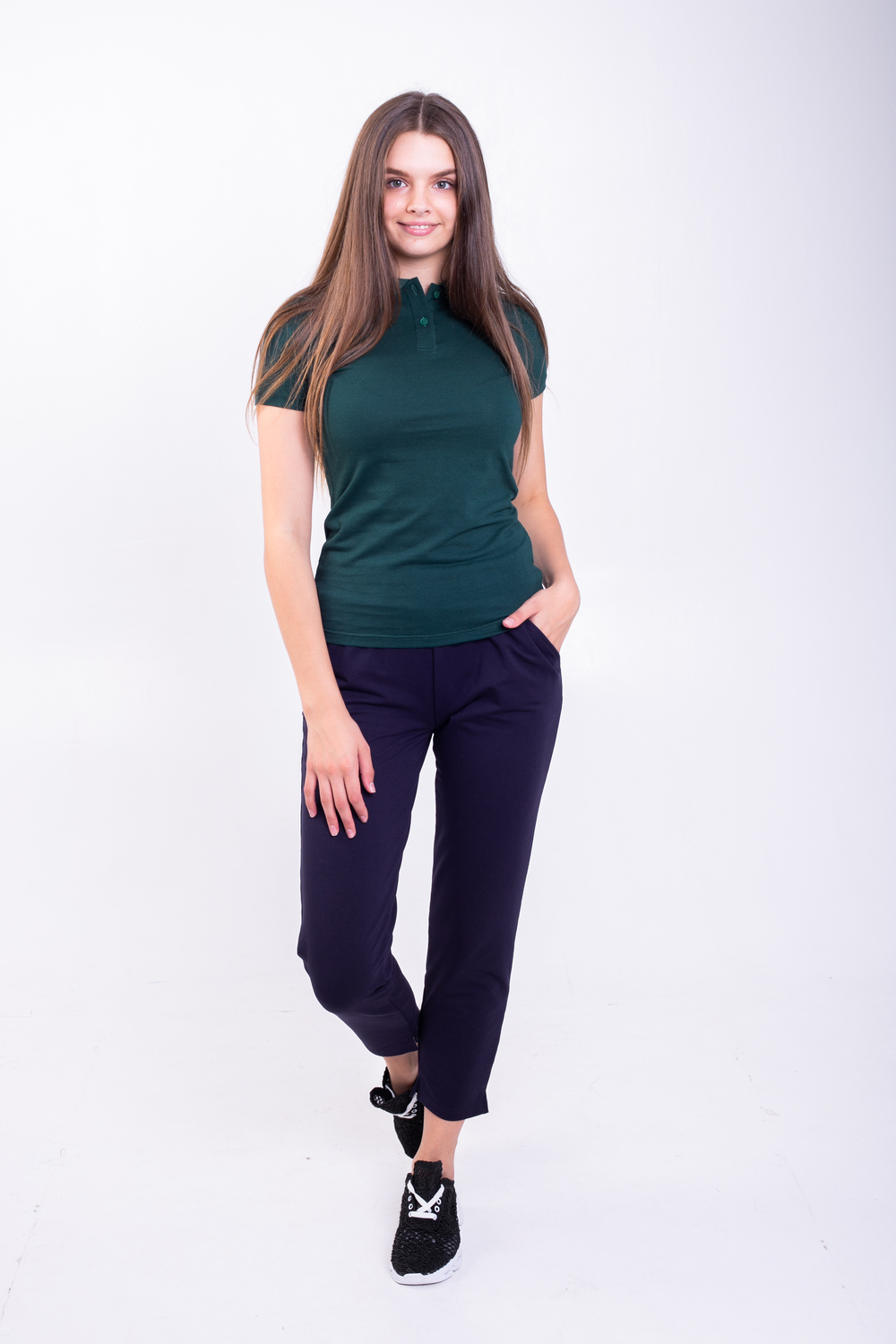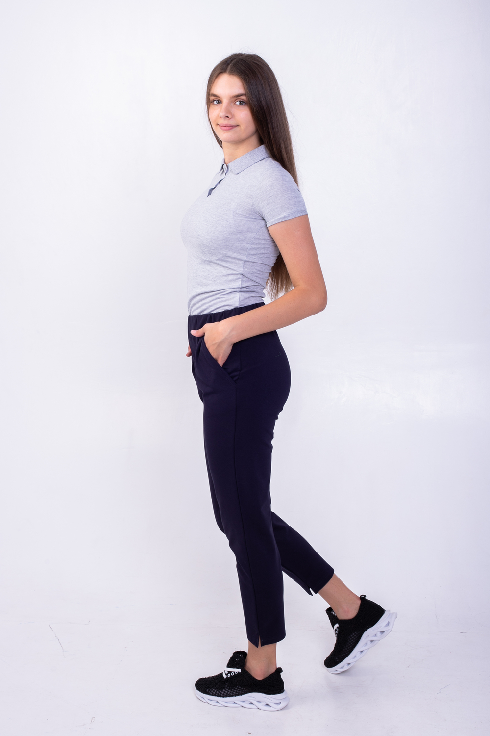 Штани трикотажні жіночі. Дана модель має вмісткі кишині, верх виробу на зручній резинці, прямого кроя, трішки завужені до низу. Внизу штанини розрізи. Дуже зручна модель, як для повсякденого використання, так і для занять спортом, якщо зверху одягнути піджак – дані штани виглядають як класичні. Дуже великим попитом користуються у лікарів. Коліна не витягуються, довго мають первісний вигляд, навіть при частому пранні тканина не кашлатиться і має насичений колір.